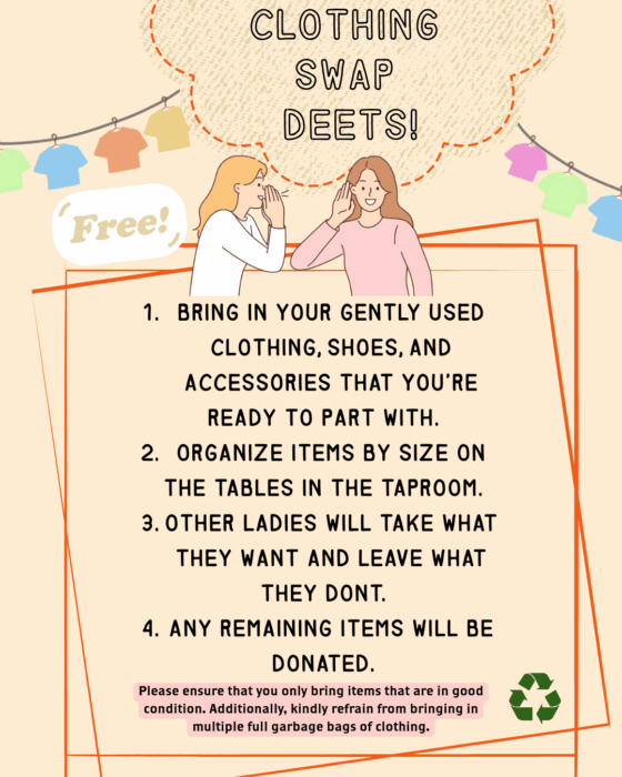 👗 Clothing Swap – Clean out your closet and bring gently loved clothing, shoes, or accessories you’re ready to part with. Lay out your items, browse what others have brought, and take home “new-to-you” treasures. It’s a sustainable and budget-friendly way to refresh your wardrobe while connecting with other women in the community.