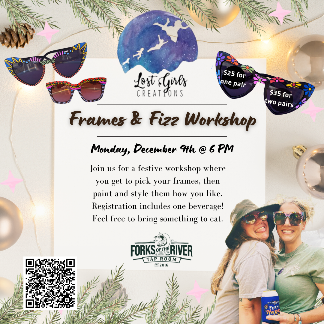 Join us for a festive and creative workshop where you can select a pair of sunglasses to paint and style according to your personal vision. This event is hosted by Lost Girls Creations, a familiar vendor at many local events. Celebrate the holiday spirit with us!