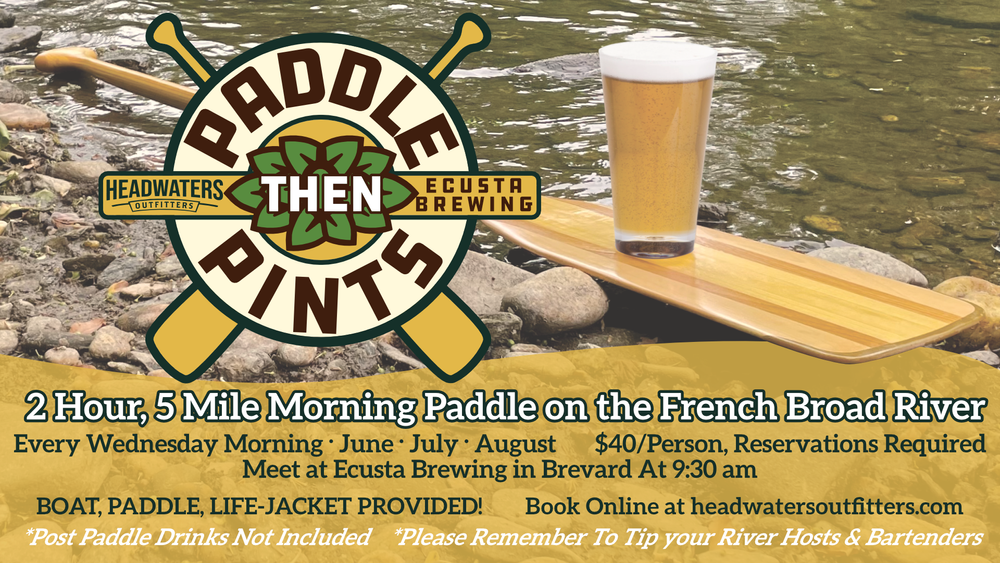 Join us for Paddle Then Pints with Ecusta Brewing Company for a 2-hour paddle trip down the French Broad and end at Ecusta Brewing for a cold craft beer (drinks not included in cost). Headwaters Outfitters will meet you at Ecusta Brewing at 9:30am with your boats, life-jackets, and paddles. A quick 5-minute shuttle to Pisgah Forest Access will be the start of your paddle. End your paddle at Penrose Access. The shuttle (about 10 min) will take you back to Ecusta Brewing Company around 12:00pm. Drink Responsibly! Reservations Required! Drinks Not Included In Cost
