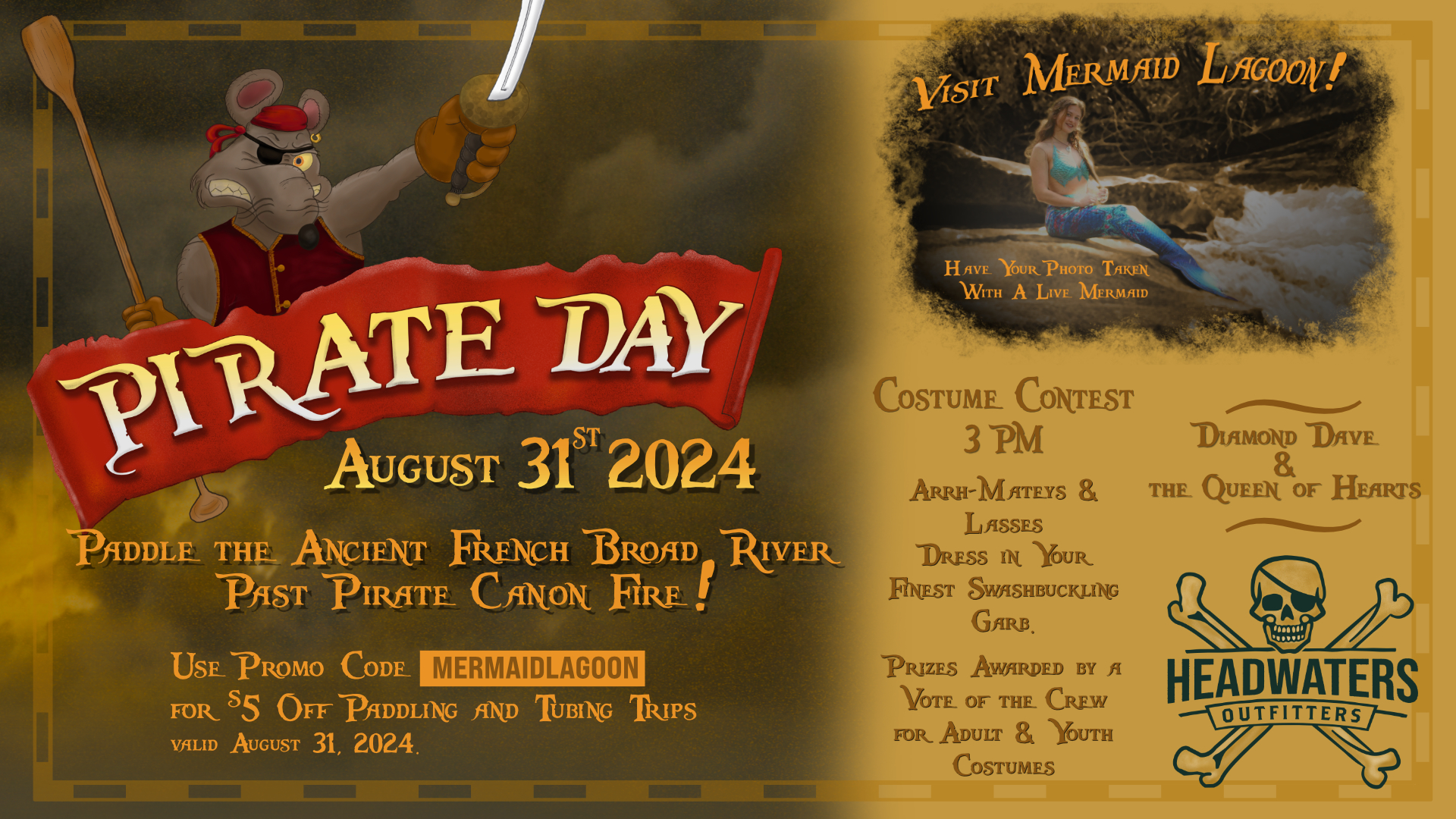 Get ready for a swashbuckling adventure with real river mermaids joining our 3-hour paddling escapade! From a kids’ corner bursting with activities to a fierce costume contest, Mama Bears Food Truck, and the electrifying performance by Diamond Dave & The Queen Of Hearts on stage, it’s going to be a day to remember! Head to Penny Lane Exchange in downtown Brevard for your costume needs.  Use Promo Code MERMAIDLAGOON for $5.00 off your paddling or tubing adventure that day.  Get your picture taken with real Blue Ridge Mountain Mermaids on our Paddling Trip.  BEWARE- Pirates are on the river!