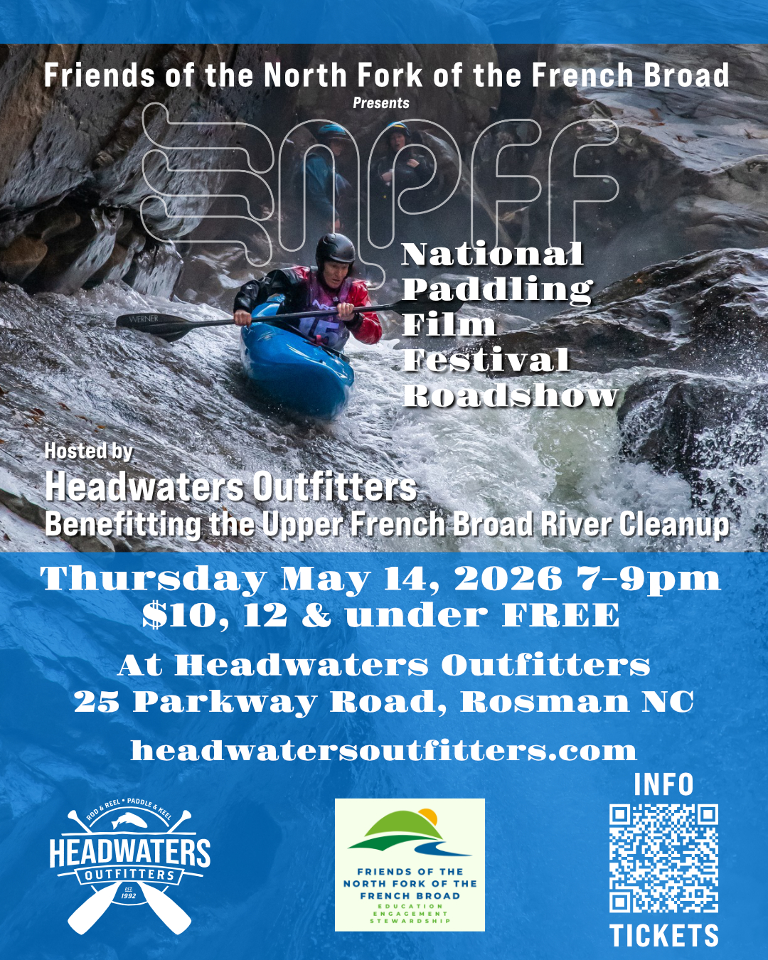 National Paddling Film Festival Roadshow Date: Thursday, May 14th Time: (7:00pm-9:00pm) Cost: $10, Kids 12 & under FREE Presented by: Friends of the North Fork of the French Broad Hosted by: Headwaters Outfitters Fundraiser for: The Annual Upper French Broad River Clean Up Day Enjoy quality paddlesport films with other paddling enthusiast; while supporting waterway […]