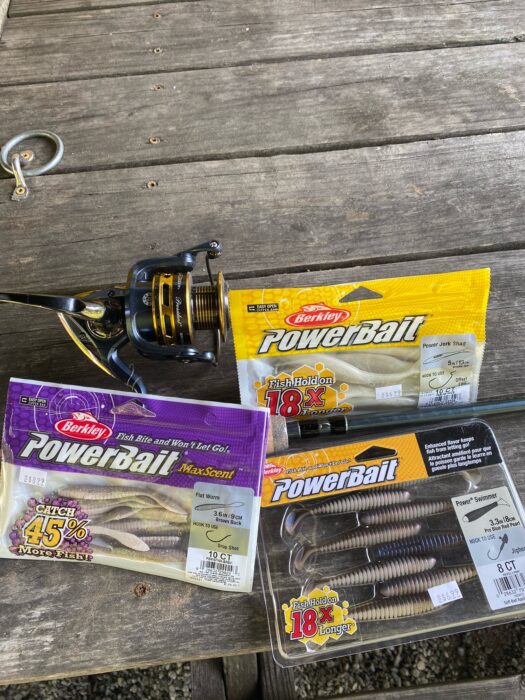 Fork Outfitters LK Legacy 9 foot 6 weight, paired with a Hardy UDLA 4/5/6 reel. This set up is going to give you a lightweight rod to fish long days with a powerful backbone to fight aggressive bass. Spool this up with some Cortland Bass specialty series floating line. The key for this floating line will be fishing for schooling fish or fish more apt to feed looking up for small bait. A great way to coax these fish is a white double barrel slider. Fish the slider on a loop knot connection. Give it erratic action like a fleeing baitfish when near active fish. When you are searching for active fish, fish the slider slowly with longer pauses after a cadence of multiple short strips. On the lake target flats in front of creek mouths in the 5 to 15 foot depth range. If you struggle to find fish willing to come all the way to the surface to feed, change out your line to a fairly moderate sink rate sinking line. Fish small baitfish flies in the 3 to 4 inch range, mushmouth in a natural shad pattern is a great choice. This will get your fly down in the water column, but keep it above the fish, remember fall fish in our area love to feed up.. Not down. small shad imitations. The Pflueger President medium powered spinning rod spooled with a 10 to 15 pound braided main line.