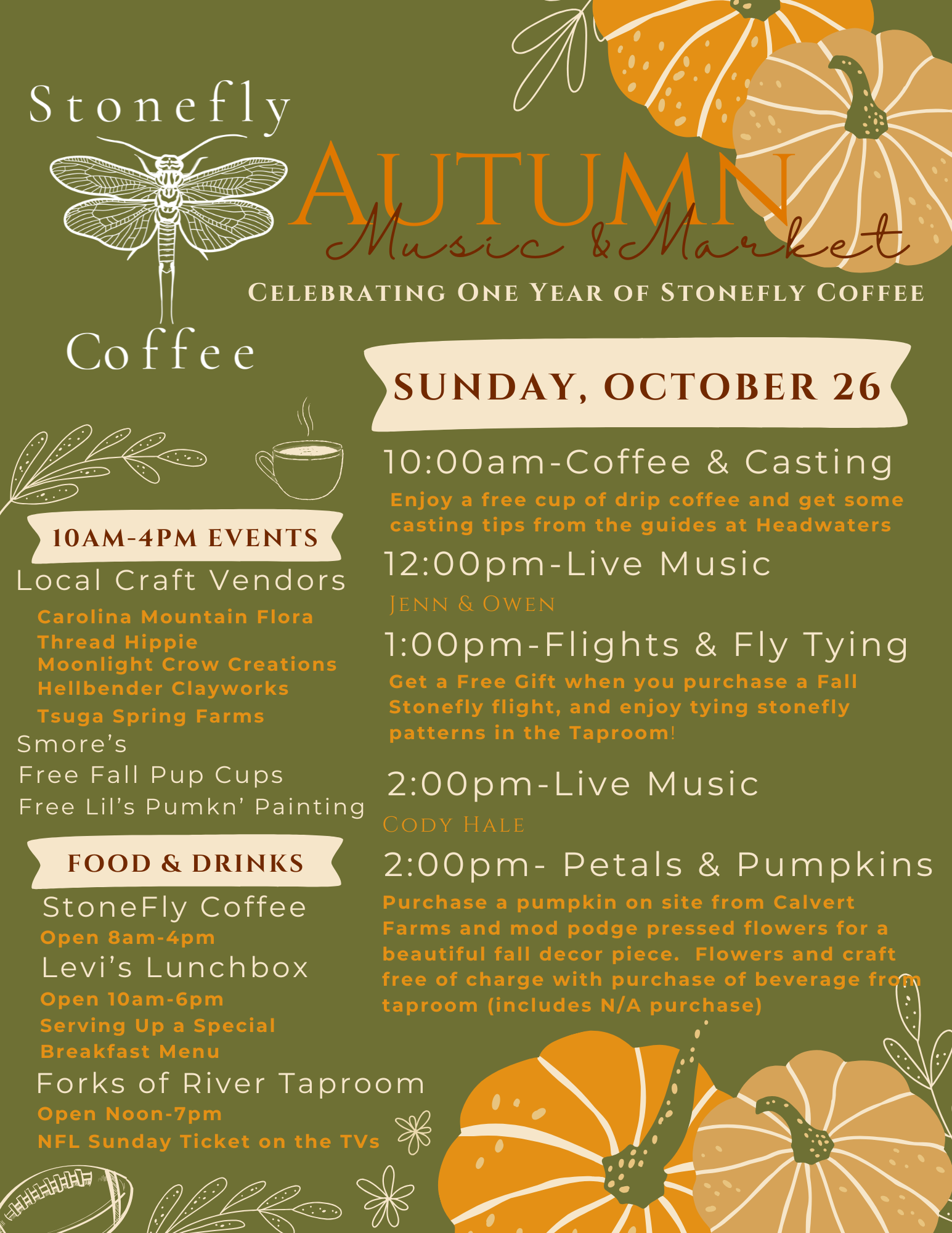 Headwaters Outfitters Outdoor Adventures 25 Parkway Rd, Rosman, NC, United StatesStonefly Coffee Autumn Music & Market Celebrating One Year of Stonefly Coffee! Join us for a day full of live music, local vendors, fall flavors, and family fun at the Autumn Music & Market on Sunday, October 26. We’re celebrating the first anniversary of Stonefly Coffee with community, creativity, and seasonal festivities! ✨ Event Highlights […]