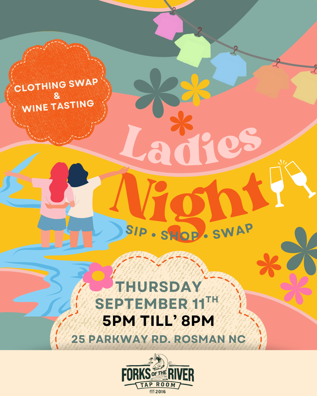 Forks of the River Taproom 25 Parkway Road, Rosman, NC, United States✨ Ladies’ Night at Forks of the River Taproom ✨ Thursday, September 11th | 5–8pm We’re bringing together two of our favorite things for an evening of fun and community—a clothing swap and a wine tasting! 👗 Clothing Swap – Clean out your closet and bring gently loved clothing, shoes, or accessories you’re ready to […]