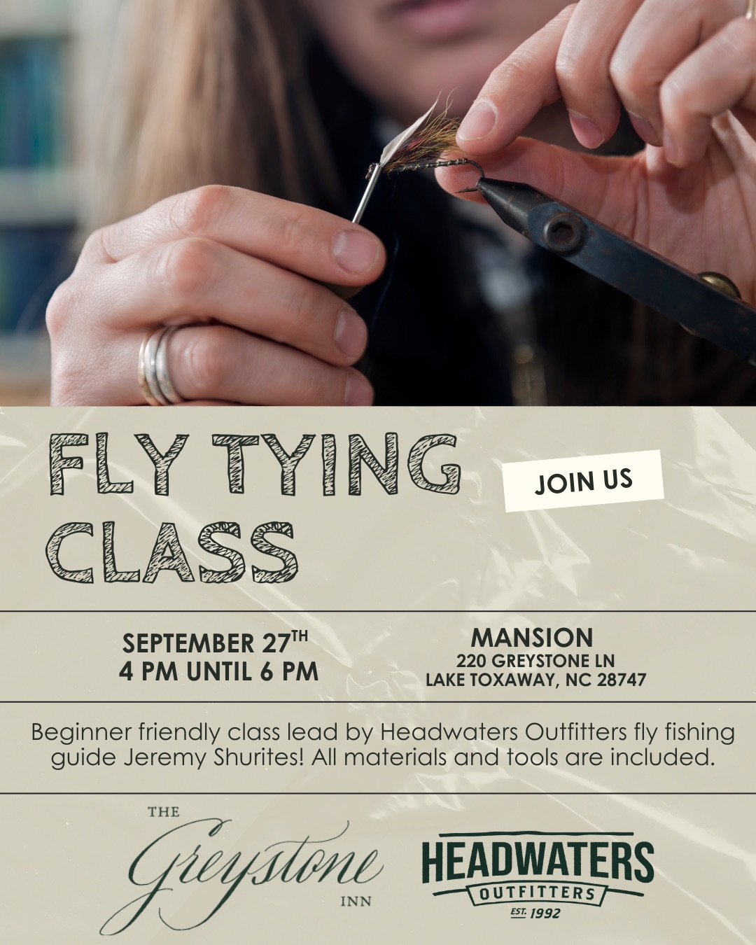The Greystone Inn 220 Greystone Ln, Lake Toxaway, United StatesJoin fly fishing guide Jeremy Shurites for a fly tying class at The Greystone Inn on Saturday, September 27th from 4 PM until 6 PM. All skill levels are welcome as this is a beginner-friendly class. Attendance is free, but gratuity for Jeremy is appreciated!