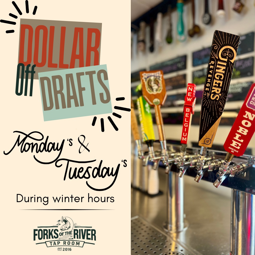 Forks of the River Taproom 25 Parkway Road, Rosman, NC, United StatesJoin us on Monday's and Tuesday's for dollar off drafts during our winter hours (2 PM until 6 PM).