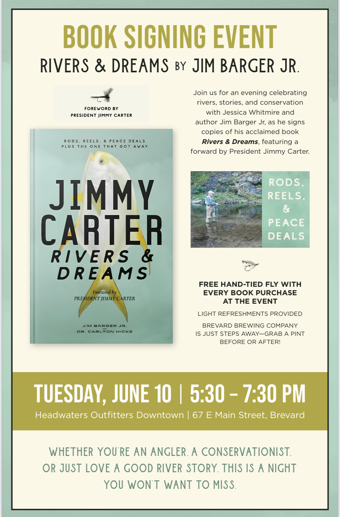 Headwaters Outfitters Downtown 67 E Main St, Brevard, NC, United StatesBook Signing Event: Rivers and Dreams by Jim Barger Jr. Forward by President Jimmy Carter Tuesday, June 10th | 5:30 PM – 7:30 PM Headwaters Outfitters Downtown | 67 E Main Street, Brevard Join us for an evening celebrating rivers, stories, and conservation with author Jim Barger Jr., as he signs copies of his acclaimed […]