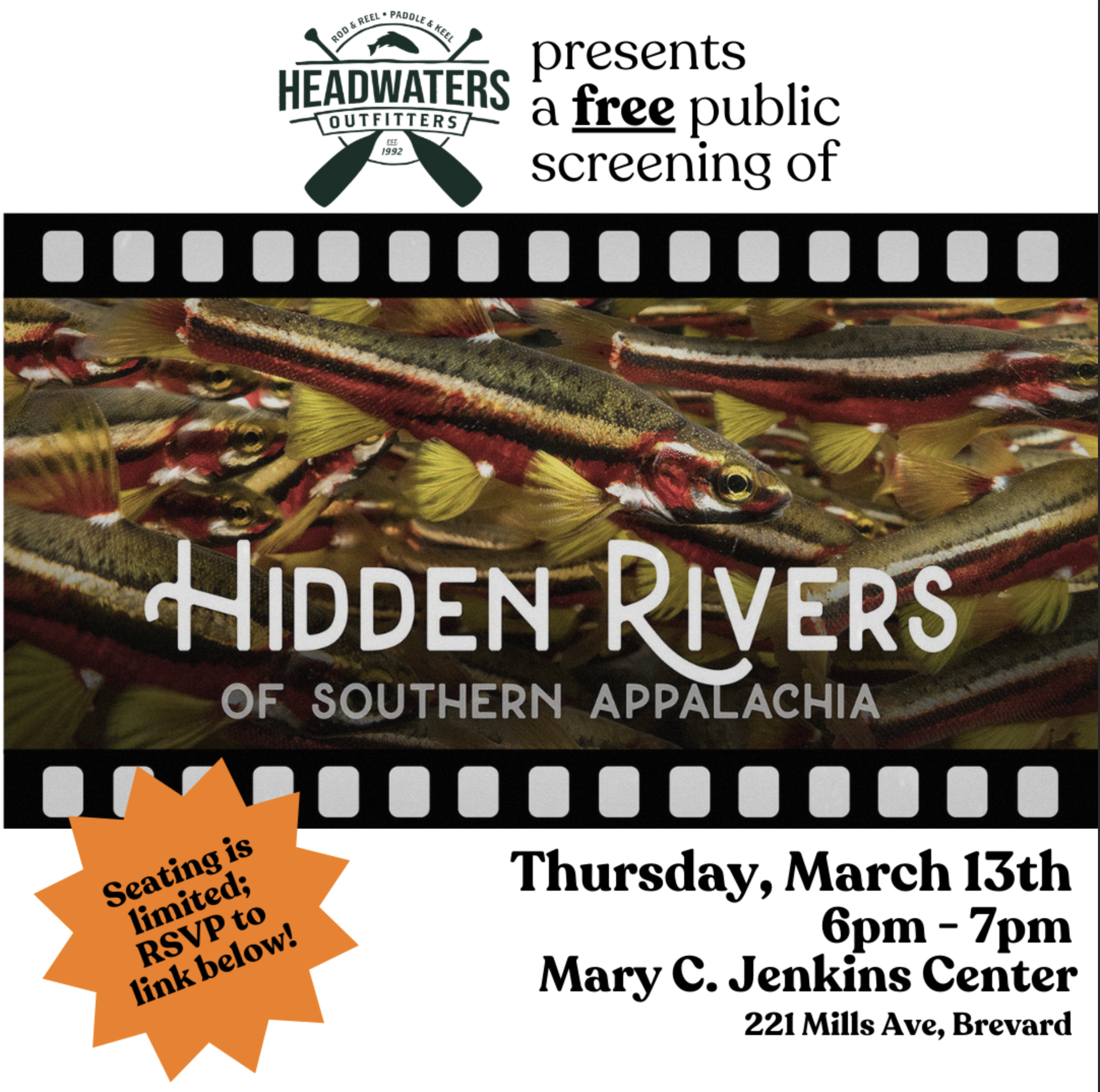 Mary C Jenkins Center 221 Mills Ave, Brevard, NC, United StatesHidden Rivers Screening Hidden Rivers is a 1-hour film that explores the rivers and streams of the Southern Appalachian region, North America’s most biologically rich waters. The film follows the work of conservation biologists and explorers throughout the region - revealing both the beauty and vulnerability of this aquatic life - and how many people […]