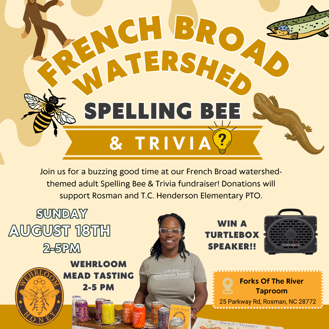 Forks of the River Taproom 25 Parkway Road, Rosman, NC, United StatesJoin us for a buzzing good time at our French Broad watershed-themed adult Spelling Bee & Trivia fundraiser! Donations will support Rosman and T.C. Henderson Elementary PTO. -Registration begins at 2:00 pm (cash only please)-$15 per person per event or $20 for both events -Spelling Bee will start at 2:30 pm and will consist of […]